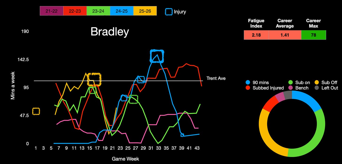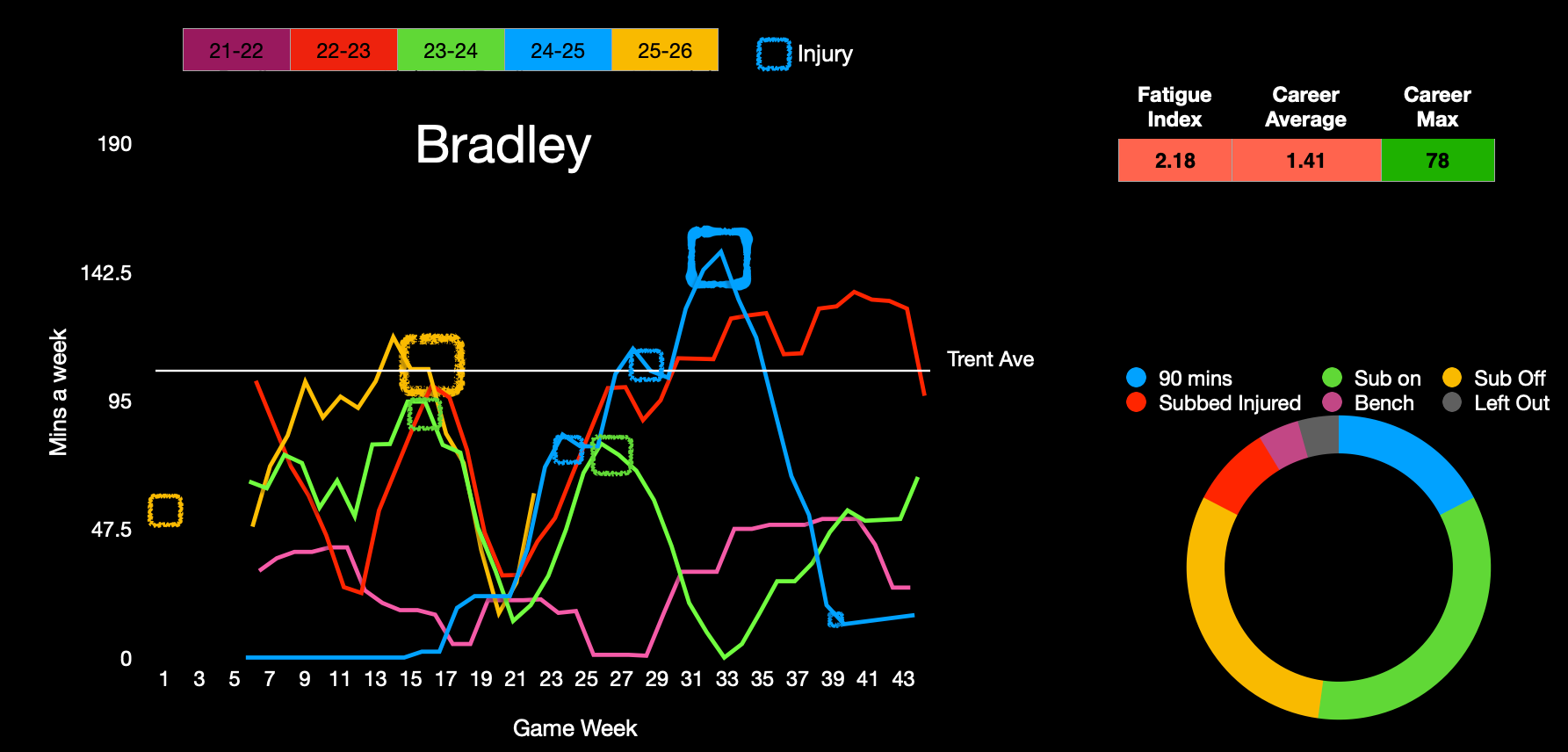 For an established Premier League defender, that figure is not remarkable. For a player with Bradley’s exposure history, it matters a great deal. Across his entire career, he has only once completed more than two hundred and fifty minutes in a two week period without subsequently sustaining an injury, and that was two years ago. The only season in which he exceeded three thousand minutes came in the Championship. As a Premier League player, he has never passed roughly two thousand three hundred minutes in a campaign.
