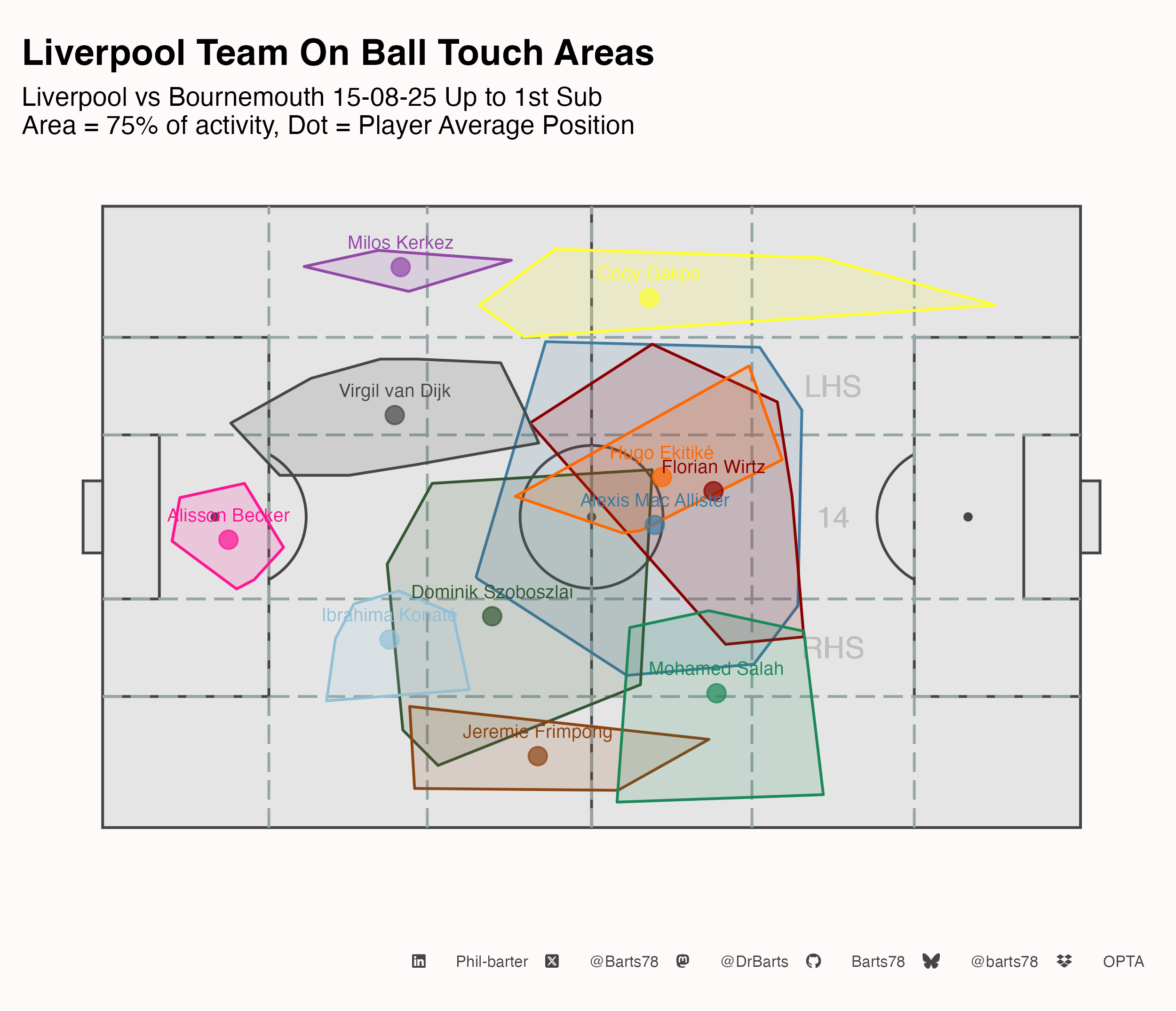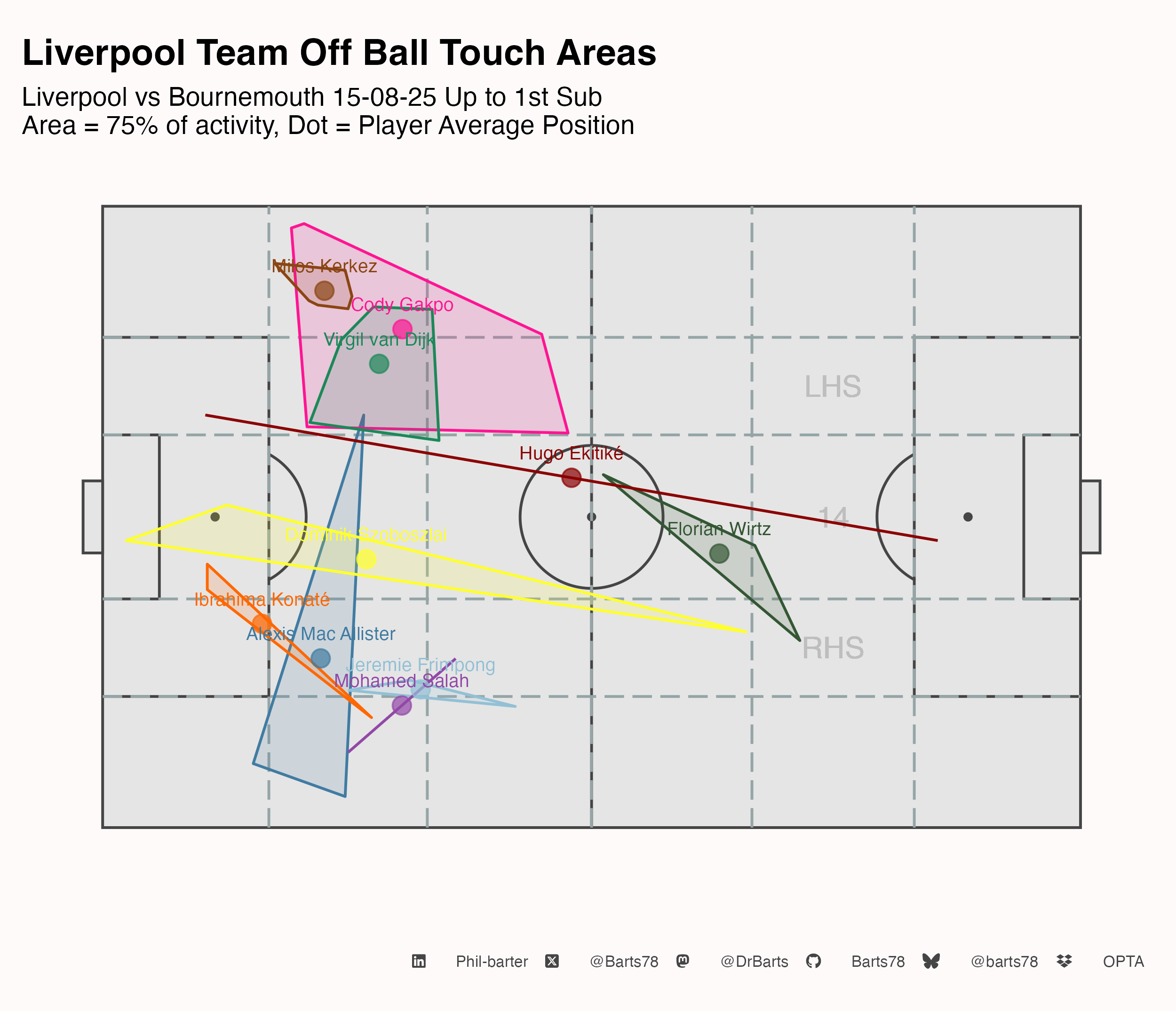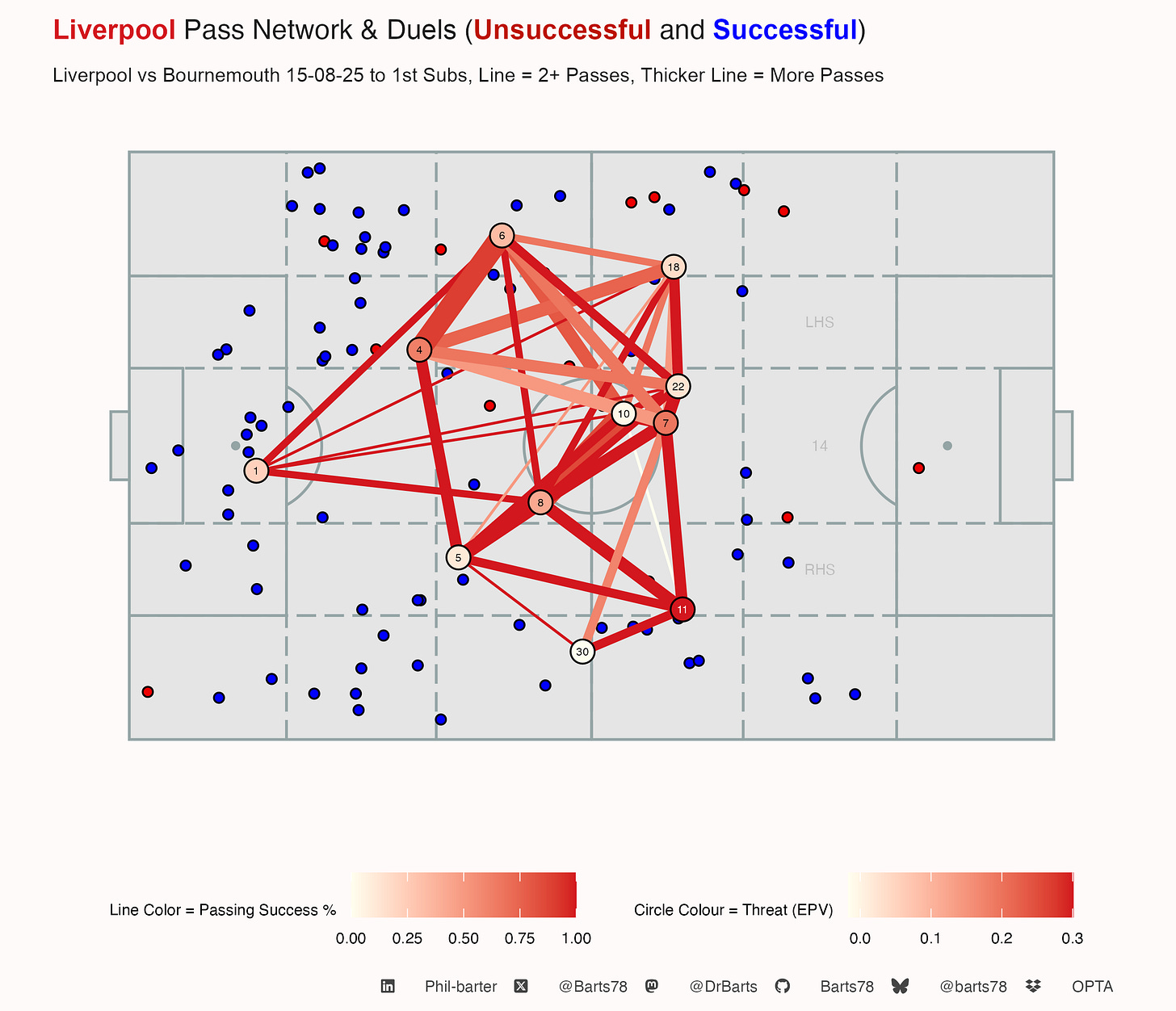 Slot has had to compromise. Mac Allister wasn’t fit. Gravenberch wasn’t available. He’s had to move pieces around. But again, compromise explains it, it doesn’t excuse it. The club needs to get players into their correct positions quickly because this current setup is unbalanced. As the pass map (up to first subs) below shows, three of our players are in the same zone, (Mac Allister, Ekitiké and Wirtz), with a total of 6 outfield players on our left side, and no one on average in the half spaces. We need to find a better balance going forwards, and not leave mo isolated, only Dom and Wirtz found Mo more than 5 times through passes, accounting to only 5% of our created threat.
