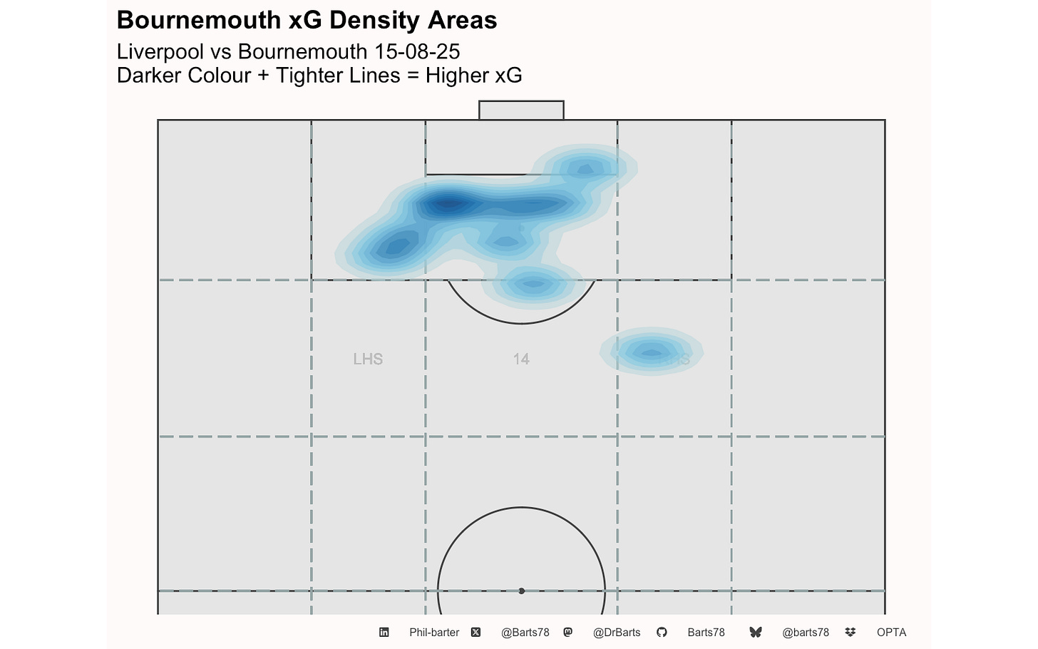 Liverpool conceded 10 shots worth 1.7 expected goals in this game. Last season, they gave up more than that in only 5 league matches. Four of those came after the title was already won. So this is already near the worst end of the spectrum. Bournemouth created 3 big chances at Anfield. That simply should not be happening. Looking at the density plot below, it indicates how much xG we conceded in central areas and in our PK box. Conversely last season we ensure that the shots were not allowed from central areas, and the opposition found it hard to generate xG in our PK box.