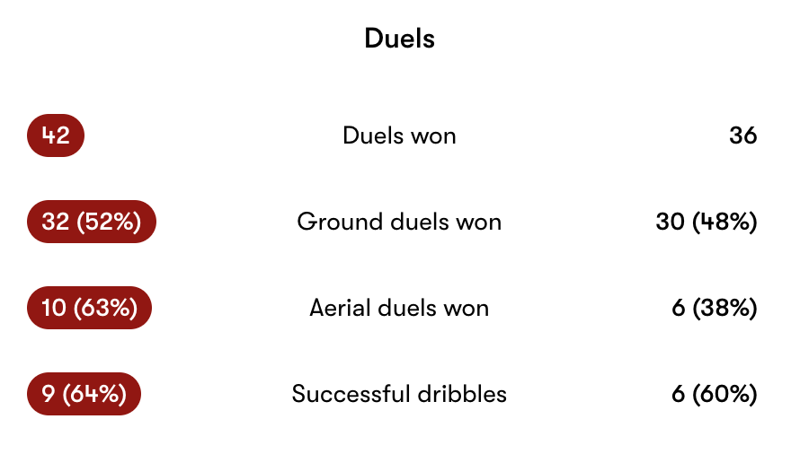 The stats reflect that clarity. Liverpool won 42 duels compared to Villa’s 36, edged the ground duels (32 to 30), and were dominant in aerials (10 to 6). With 9 successful dribbles to Villa’s 6, Liverpool imposed their physicality and were efficient in transitions.
