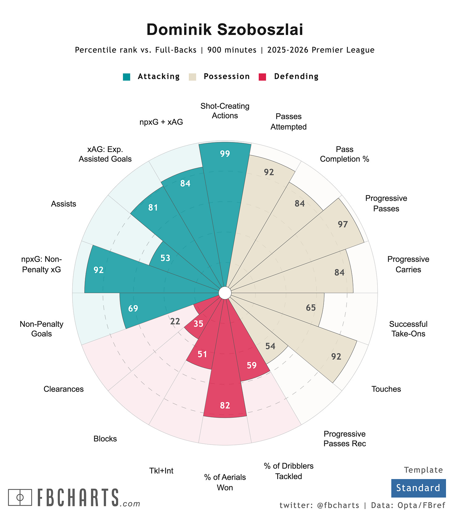 Dominik Szoboszlai does not occupy a position; he occupies the pitch. Right-back, holding midfielder, number eight, number ten, it makes no difference. Wherever he begins, he ends up influencing everything. This season, he has moved across the field like a man who owns it. His heatmap for the season so far is a blazing sheet of red and orange, a visual record of constant involvement, with almost no quiet corner left untouched.