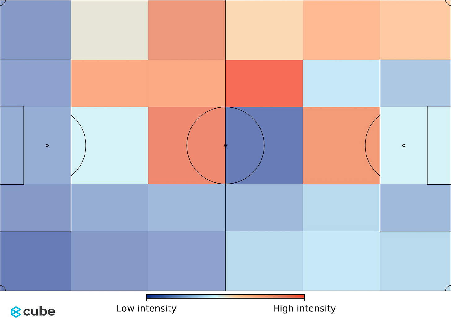 There’s a case to play Wirtz on the left of a front three, drifting inside to operate almost as a hybrid No 10. This role would replicate his movement map at Leverkusen, where his expected threat heatmap shows red-hot activity just outside the left edge of the penalty area. From here, he cuts across, releases angled through balls, or takes on defenders one-on-one.