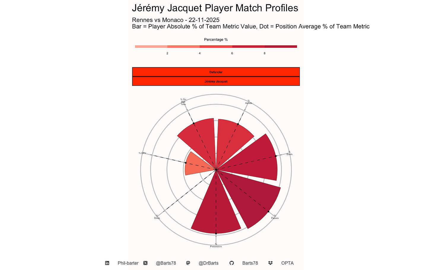 I first became seriously aware of Jeremy Jacquet through sustained analysis rather than headline noise. What stands out immediately is not hype, but trajectory. When we run Jacquet through comparative data models, repeatedly and across different snapshots, the same conclusion keeps coming back. This is a defender whose numbers already belong in conversations well beyond his age bracket, as the below radar from a recent game shows, he is at or just above the required level in key metrics, in games, against older, more experienced CBs.