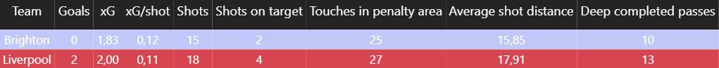 Despite the comfortable scoreline, the underlying numbers tell a more nuanced story. The accumulated expected goals were almost identical, Liverpool at 2.00 and Brighton at 1.83, with average chance quality also closely matched. Brighton were restricted to just two shots on target, which speaks well of Liverpool’s defensive execution, but the locations of those chances will give Arne Slot’s staff something to consider.