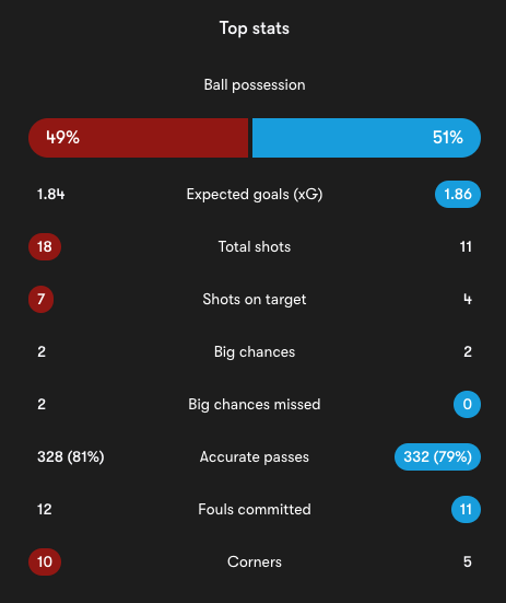 At first glance, the numbers suggest balance rather than control. Liverpool had 49% possession to West Ham’s 51%. The expected goals were 1.84 for Liverpool and 1.86 for West Ham. Total shots favoured Liverpool 18 to 11, but the underlying chance quality was almost identical.