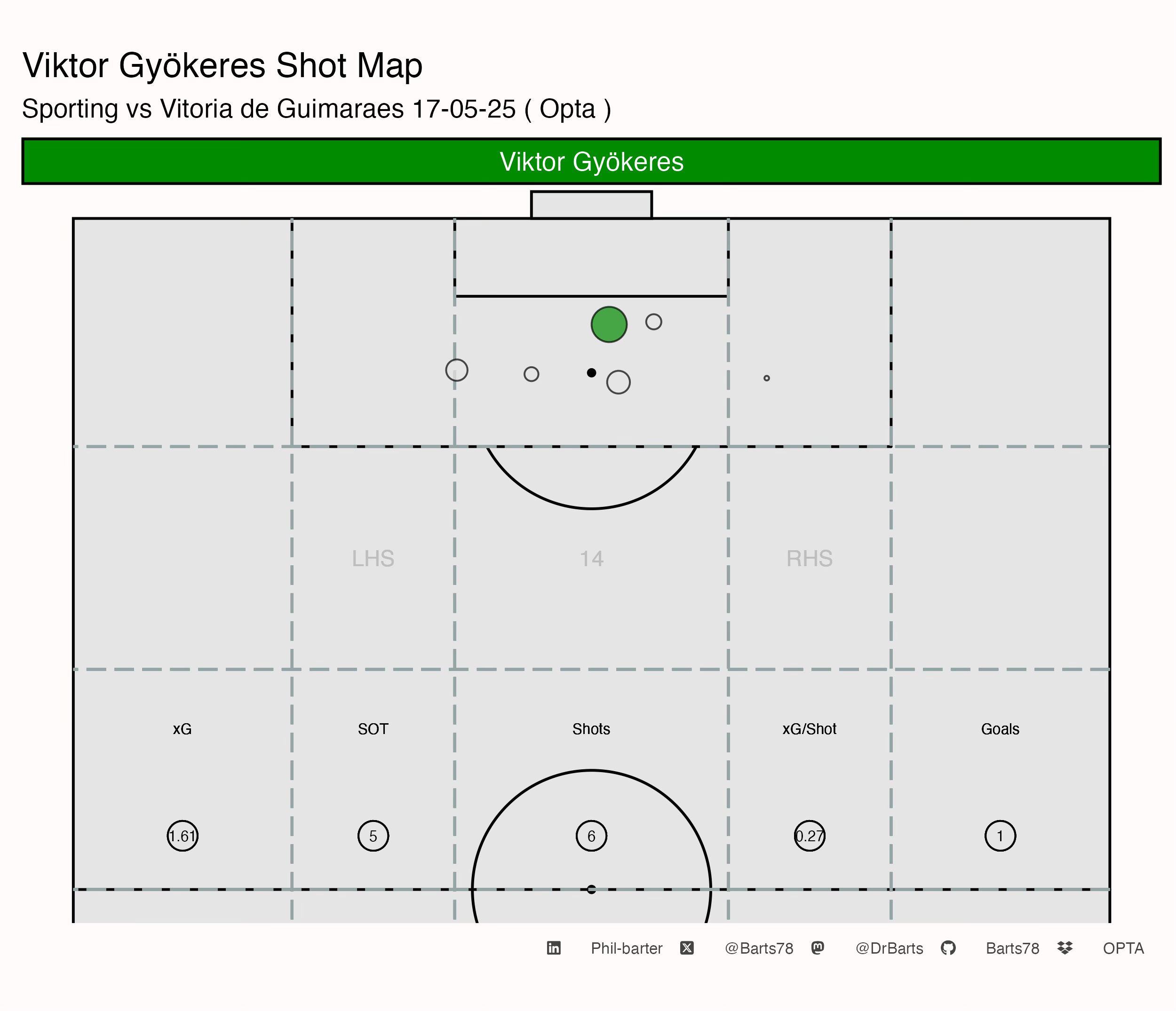 On paper, Gyökeres is unignorable. In the 2024 to 2025 Primeira Liga season, he scored 39 goals in 33 matches, with an additional 6 goals in 8 Champions League appearances. His underlying numbers support this clinical output, with 30.8 xG in the league and a non-penalty xG of 21.4, which is particularly impressive given how centralised and efficient his shot selection is. Set-pieces do not pad his stats, as his xG comes mainly through regular play or fast breaks.