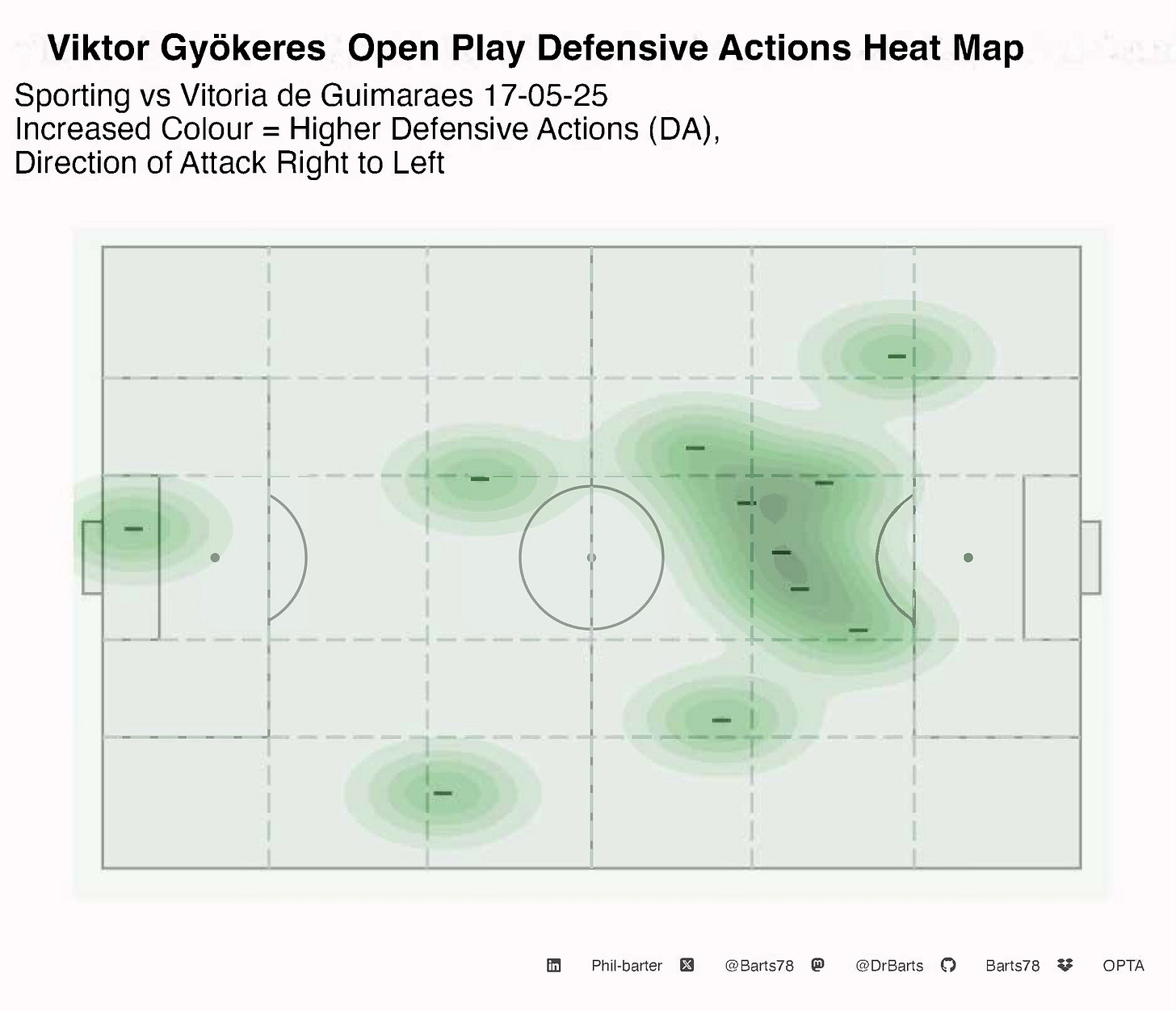 Although not known for relentless pressing in the same way as Diogo Jota or Darwin Núñez, Gyökeres can press with intelligence. His defensive actions heat map shows most of his work centrally, particularly in and around Zone 14. This is valuable because it disrupts the opposition’s deepest midfielder, often the orchestrator, without requiring the team to overstretch itself.