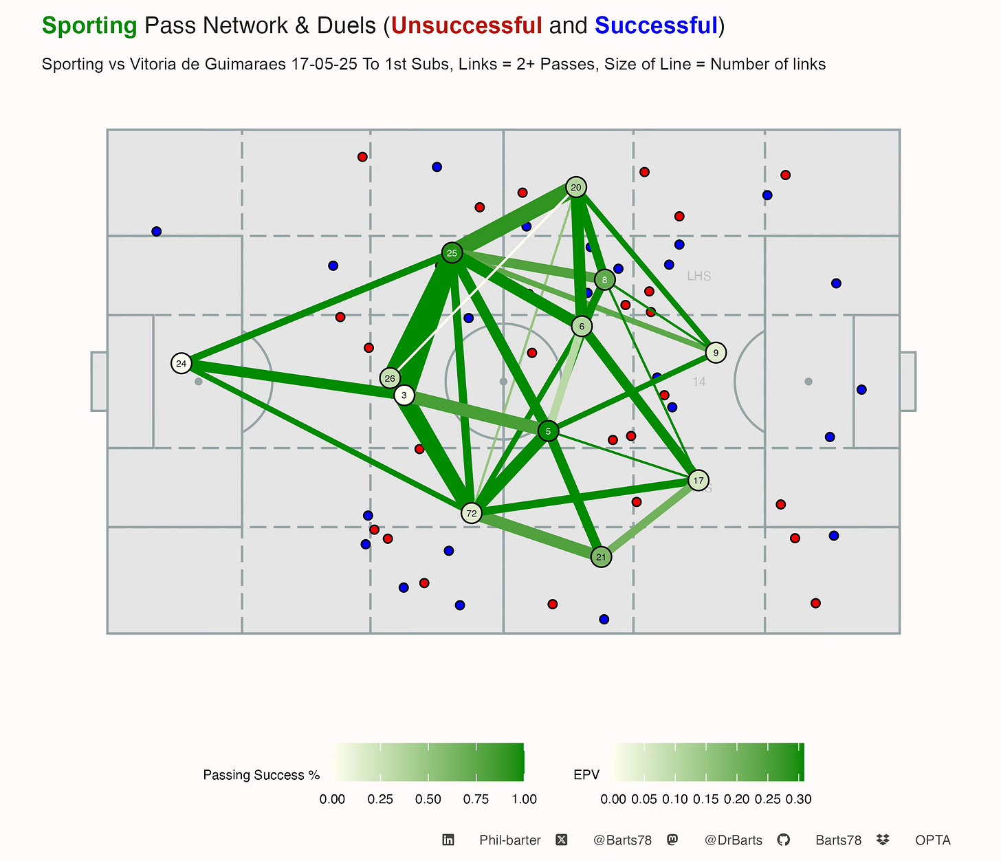 Data from Sporting’s pass networks from a recent game shows Gyökeres is most frequently connected with the left winger, though he also takes in passes from both 8s. This is promising in the context of Liverpool’s attacking shape, particularly with Dominik Szoboszlai or Alexis Mac Allister operating as advanced eights.