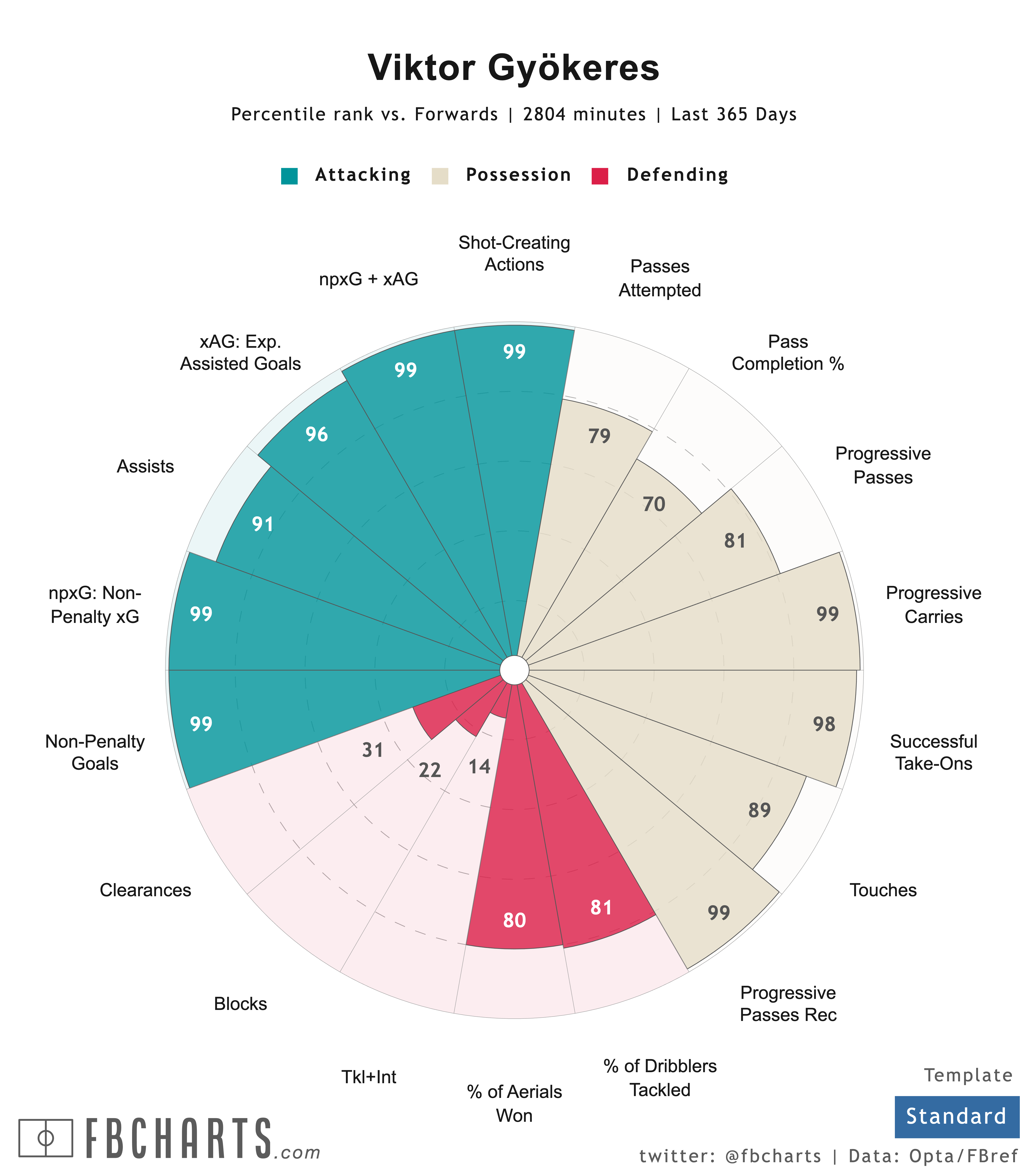 He is not a high-volume passer, averaging 22.76 passes per 90 minutes, but his involvement is purposeful. His pass completion rate of 71.4 percent may seem low, but given his central role under pressure and frequent involvement in transition, it is within acceptable bounds. More importantly, his progressive passes were received at 10.75 per 90, ranking in the 99th percentile, which tells the real story. Gyökeres is always where he needs to be, ready to receive and contribute.
