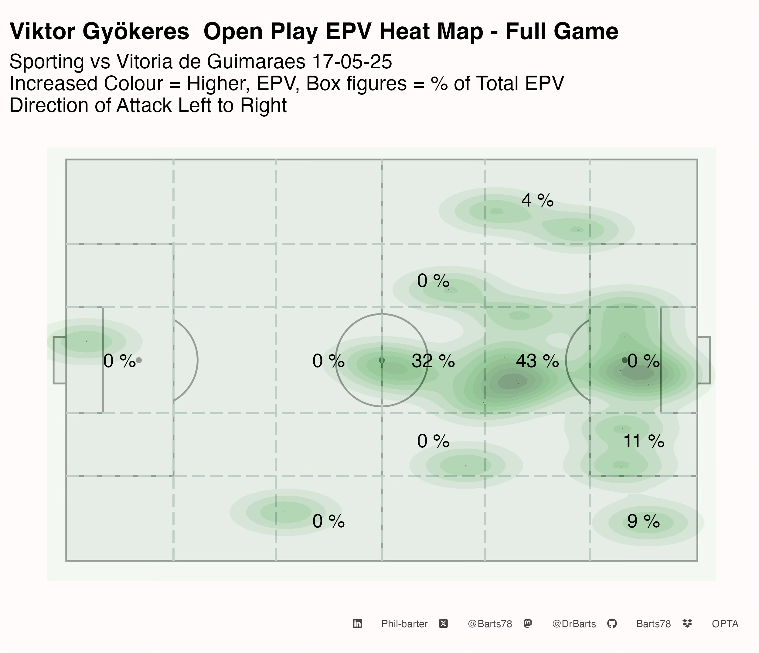 Positionally, Gyökeres fits a profile Liverpool have often lacked since Roberto Firmino's prime years. He receives the ball consistently in Zone 14, looking to link play from deep central areas. His Expected Possession Value (EPV) map from the match against Vitória de Guimarães shows that 43 percent of his threat is generated in Zone 14, with a further 32 percent in the slightly deeper central region.