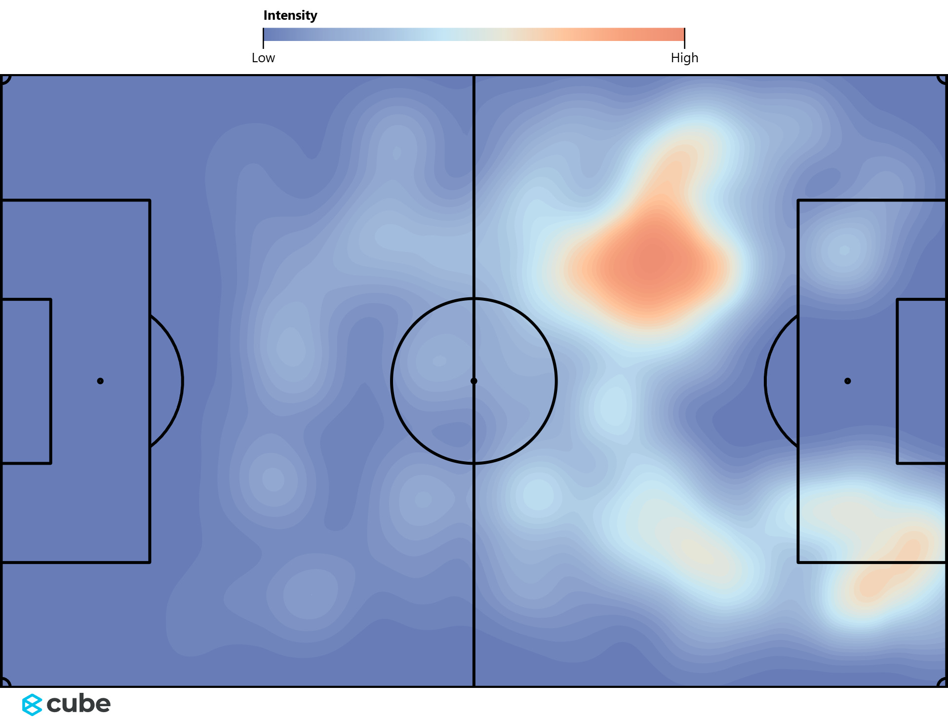 Liverpool’s expected threat data reveals a clear attacking pattern. Most danger emerged from the left half space and the right flank, driven largely by two former Bayer Leverkusen players. Florian Wirtz and Jeremie Frimpong were central to everything Liverpool did well in possession.