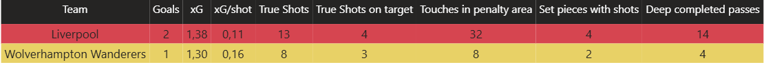 The statistical picture offers little comfort. Liverpool edged the scoreboard but not the chance quality battle. Expected goals were almost level, with Wolves generating marginally higher quality chances despite having far fewer touches in the penalty area. Liverpool recorded four times as many box touches and two and a half times as many deep completed passes, yet that territorial dominance did not translate into a clear xG advantage.