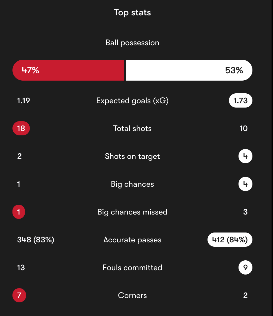 When you study the numbers properly, Liverpool had 53% possession and completed 412 accurate passes to Forest’s 348. They finished with the higher xG at 1.73 to 1.19 and created four big chances to Forest’s one.