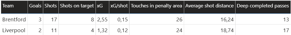 Liverpool conceded 17 shots, 8 on target, and an expected goals (xG) against of 2.55. Brentford registered a 15 percent average chance quality and managed 26 touches inside Liverpool’s penalty area. These numbers tell their own story, one of disorganisation, poor anticipation, and a failure to win key duels in both boxes.