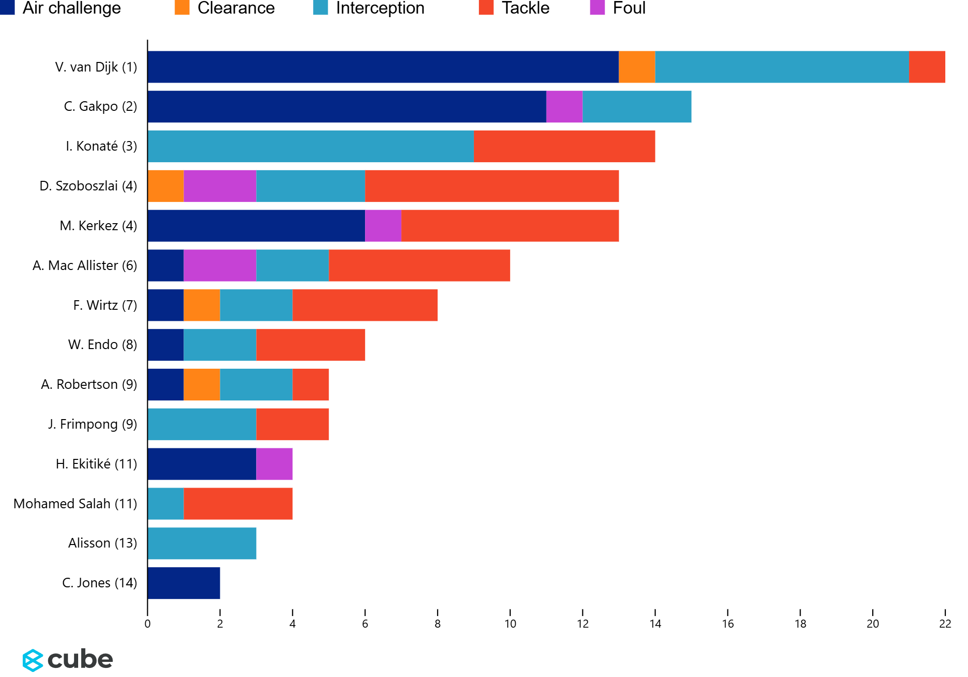Defensively, Van Dijk once again stood tallest. The defensive workrate ranking shows him leading aerial duels with 13 challenges, while Dominik Szoboszlai’s all-round effort made him Liverpool’s most industrious midfielder on the night.
