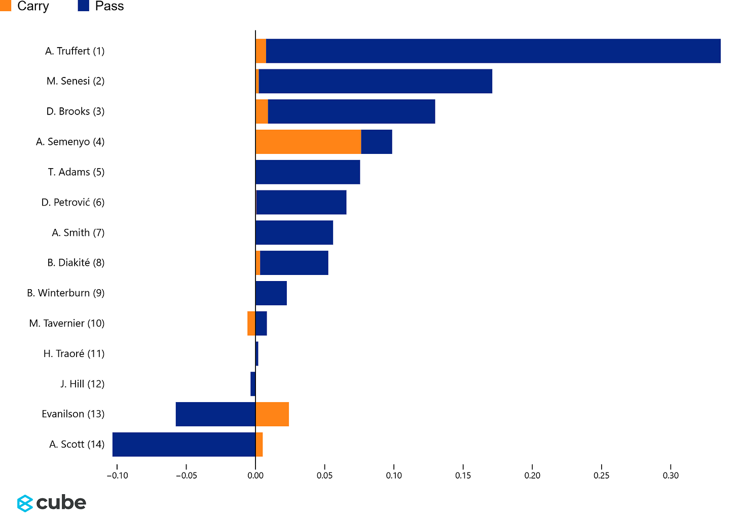 The xT ranking graphic confirms Truffert and Brooks as standouts, while Semenyo’s threat came through carrying the ball.