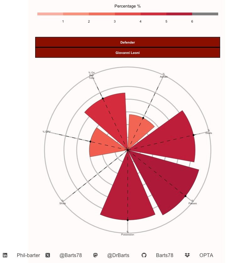 Giovani Leoni has played roughly 1,200 minutes of senior football in Serie A. That in itself is a relatively small sample, and it is worth noting that these are league minutes only. From a load management point of view, you would expect a player of his age to be able to increase that by 20 to 25% without difficulty, pushing into the range of 1,500 to 1,800 minutes. The key question is what happens during those minutes.