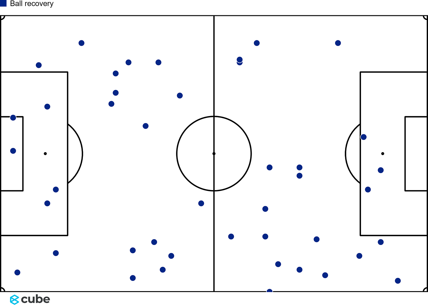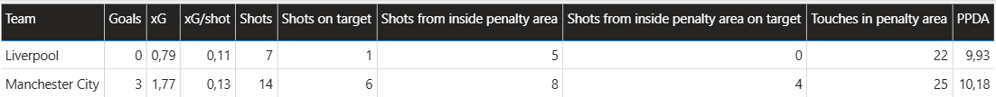 Liverpool’s attack failed to build any rhythm or real danger. With an xG of just 0.79, the output was well below the level required to trouble Manchester City. They managed seven shots, only one of which tested the goalkeeper, a speculative effort from Dominik Szoboszlai from long range.