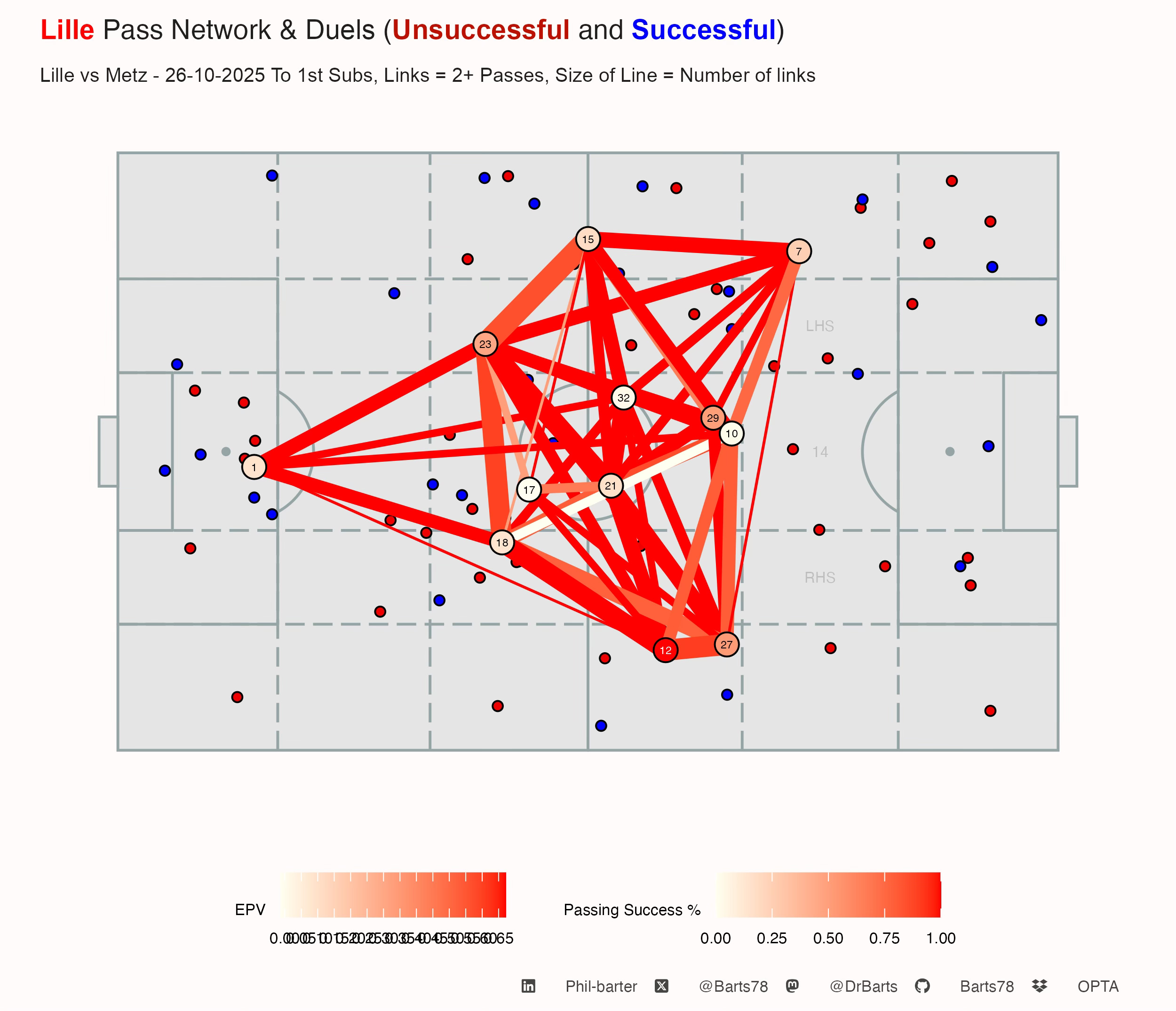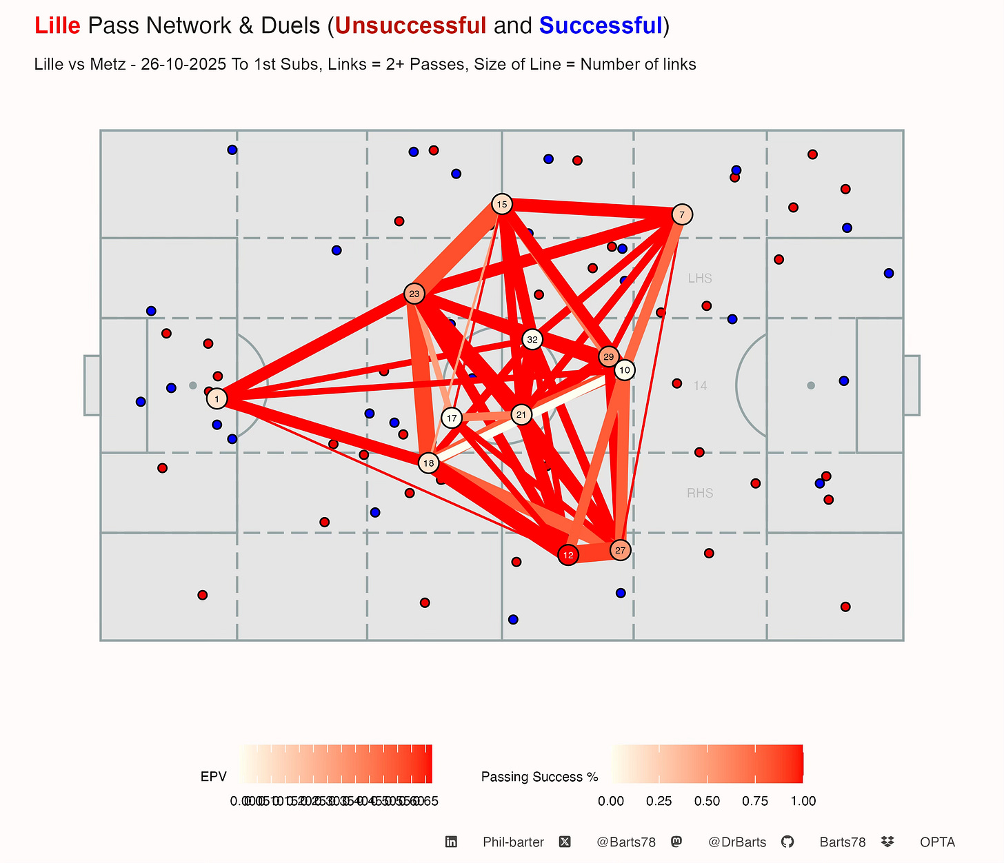 It’s easy to get lost in numbers. Percentiles, progressive passes, aerials won. But context is everything. Bouaddi, for instance, doesn’t top the charts in passing volume, but that’s not always on him. He’s playing for Lille, a team that doesn’t dominate possession the way Liverpool would. So of course, he’s not going to have the same touches or passing stats as someone playing for Liverpool, City or Bayern. In the Pass network below from a recent game, wearing number 32, you can see he is a the heart of the passing network, with strong lines from the CBs to the front players, but without creating threat as indicated but the light colour of his circle.