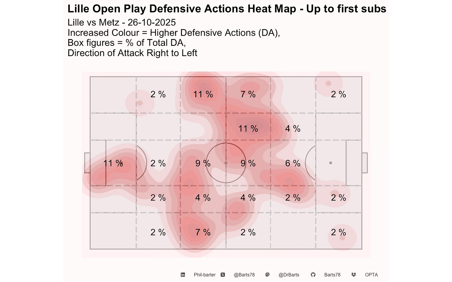 Take Ayyoub Bouaddi at Lille. This is a kid who’s already operating in the danger zones you want a six to control. His positioning in zone 14, the central area in front of the box, is mature beyond his years. He’s receiving under pressure, turning quickly, keeping it simple. He’s not Fabinho, but some of the mechanics are there. He’s proactive, strong on the ball, and intelligent in terms of reading play. As can be seen in this defensive actions plot from a recent game, the boxes he is operating in have a high % of actions, 9%, 9% 4%, 4% 11%, to prevent attacks reaching the defensive line.