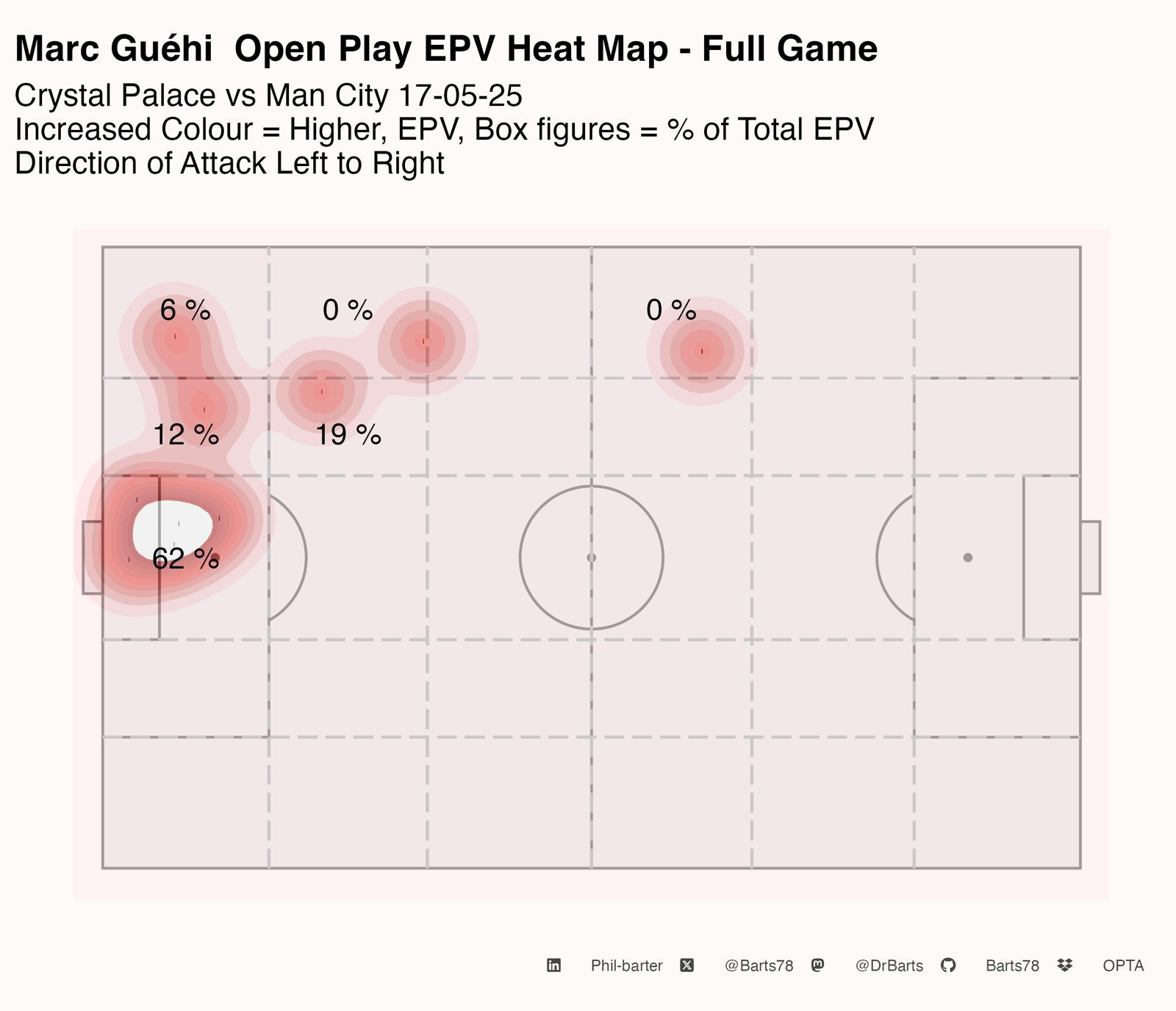 Still, it’s fair to say he prefers longer passes and that shows in the data, 71st percentile for long passes attempted 8.06 per 90. Guéhi was 13th in the Premier League last season for long passes, just two places behind Van Dijk. That suggests a player who understands how to bypass pressure and move the ball upfield quickly. The below threat (EPV) heat map shows he is involved from deep, starting those moves using his long passes. His threat number for the season per 90 is 0.11, which is slightly above Konate’s figure of 0.10, VVD finished with 0.13 . Incidentally another previous target Huijsen finished the season with a per 90 threat of 0.12, so this might also be a factor in the Liverpool scouting guys targeting Guéhi.