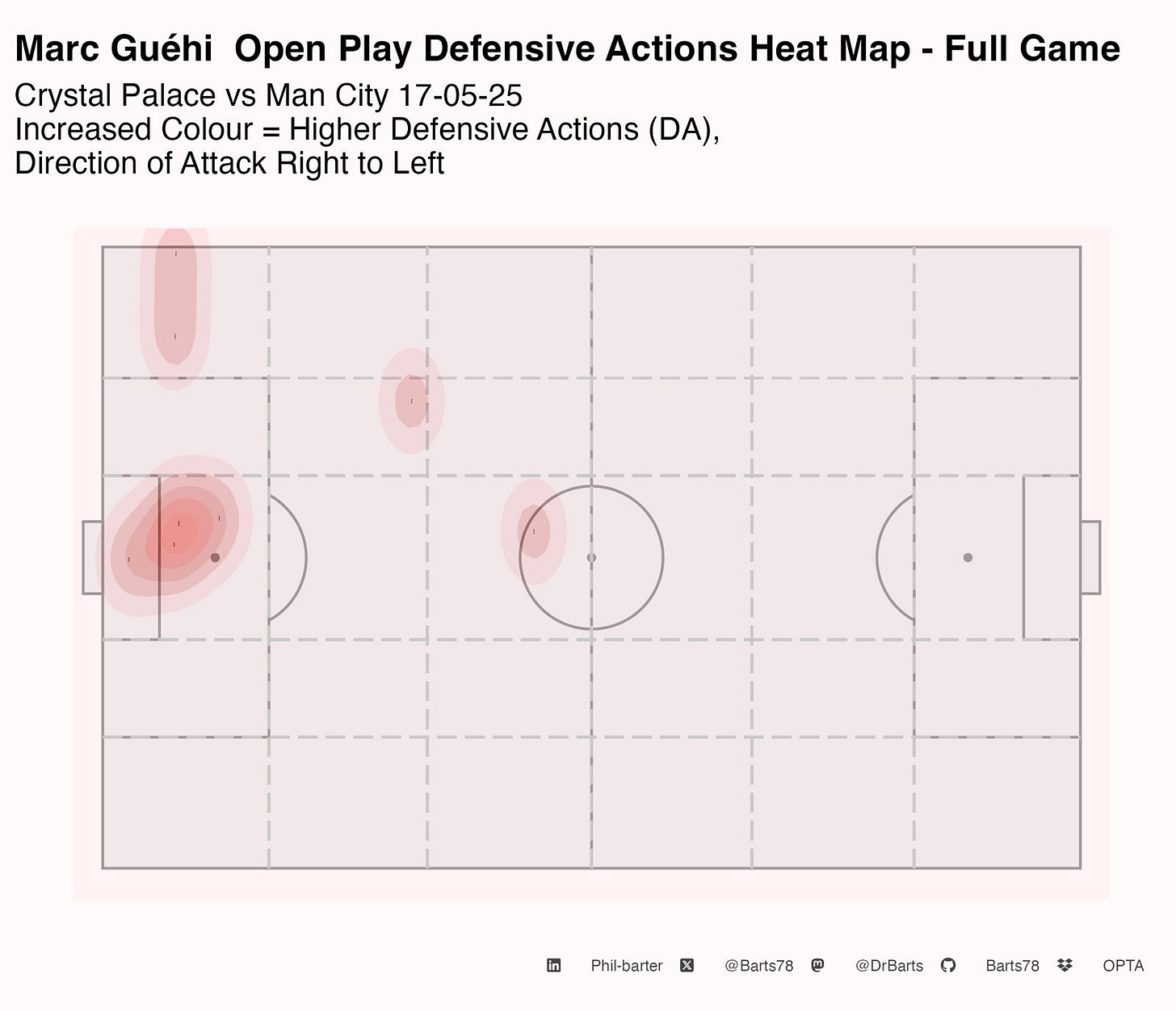 He has captained Palace. He’s an England international. He’s played on the left and right of a back four, occasionally filled in at full-back and even stepped into midfield at times. As the above image shows in a recent game, his defensive actions are mainly deep and in the left CB area. The way Palace setup will dictate this to a degree. However the position flexibility does not just help the squad, it helps the manager solve problems mid-season without compromising structure.