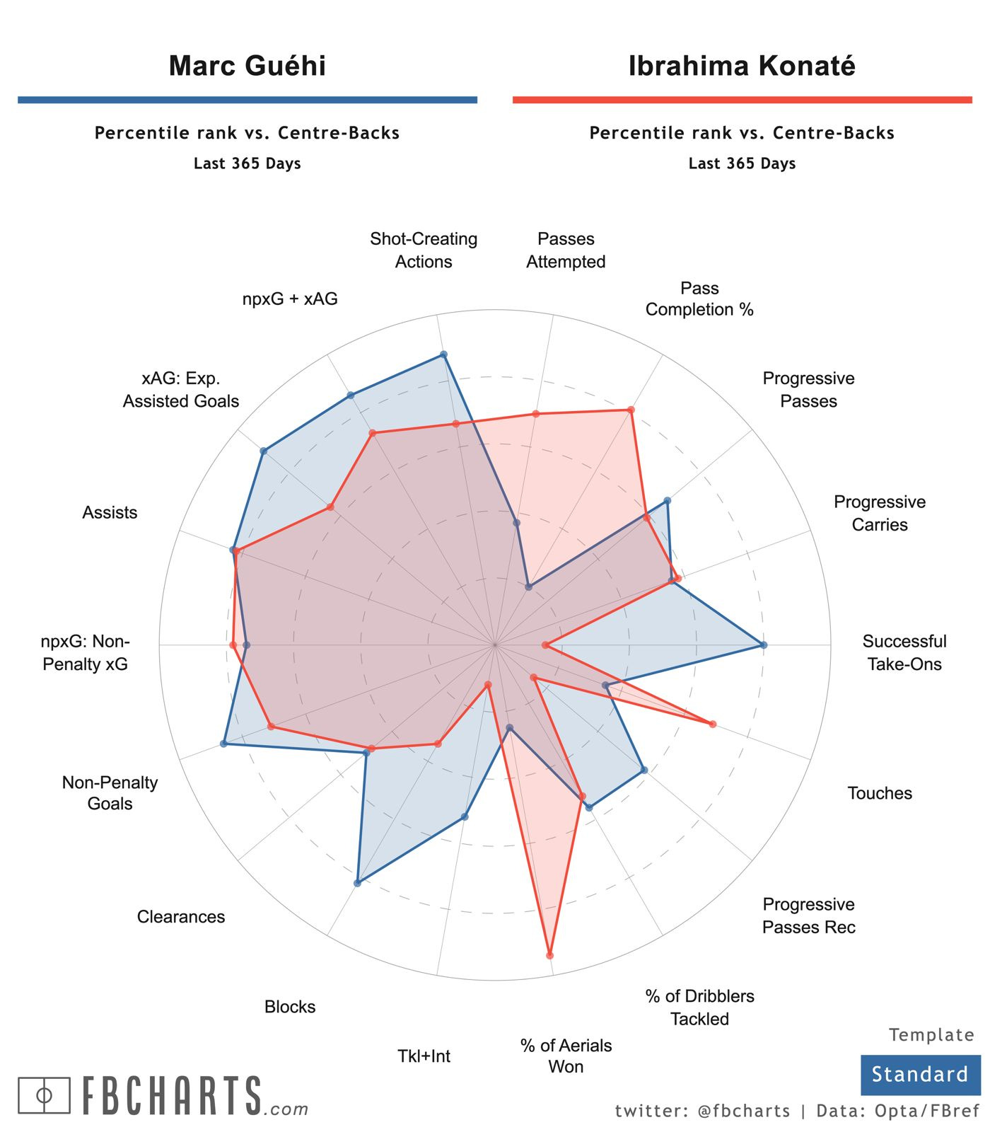 When you put him up against Ibrahima Konaté, what you see is not a direct comparison but a different skillset. Guéhi offers more in progressive passes, take-ons, and blocks, while Konaté dominates aerially and in physical duels. If Van Dijk and Konaté are your starters, Guéhi brings a complementary set of tools, not a duplicate.