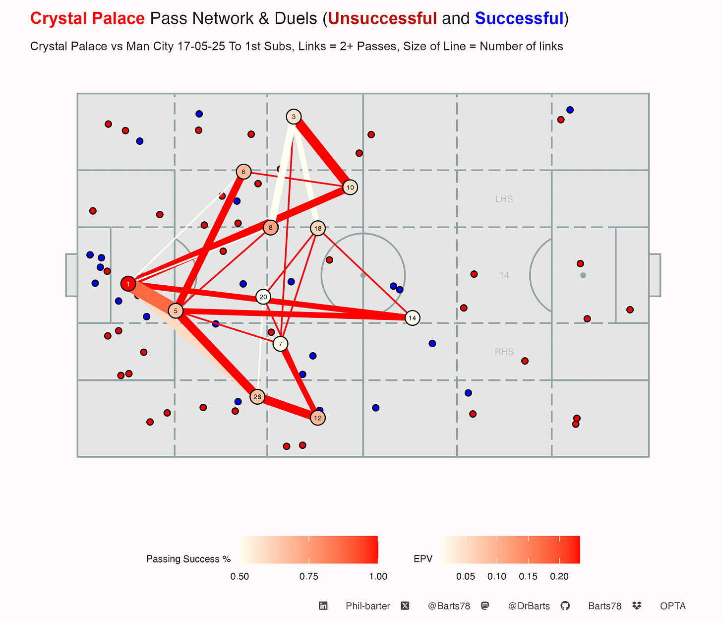 as the above pass network indicates, you don’t see as much is the short and medium-range connection play from Guéhi (number 6 in the image). His pass completion in those zones is around the 30th and 40th percentiles. as you can see from this game, he mainly played the pass to the left 8 zone or back to his CB colleague. That might partly be down to the system at Palace. When I looked at Adam Wharton’s numbers, there was a similar drop, which suggests it could be tactical rather than technical. At a team like Liverpool, where short and medium passing is more structured and options more frequent, those numbers might naturally improve.