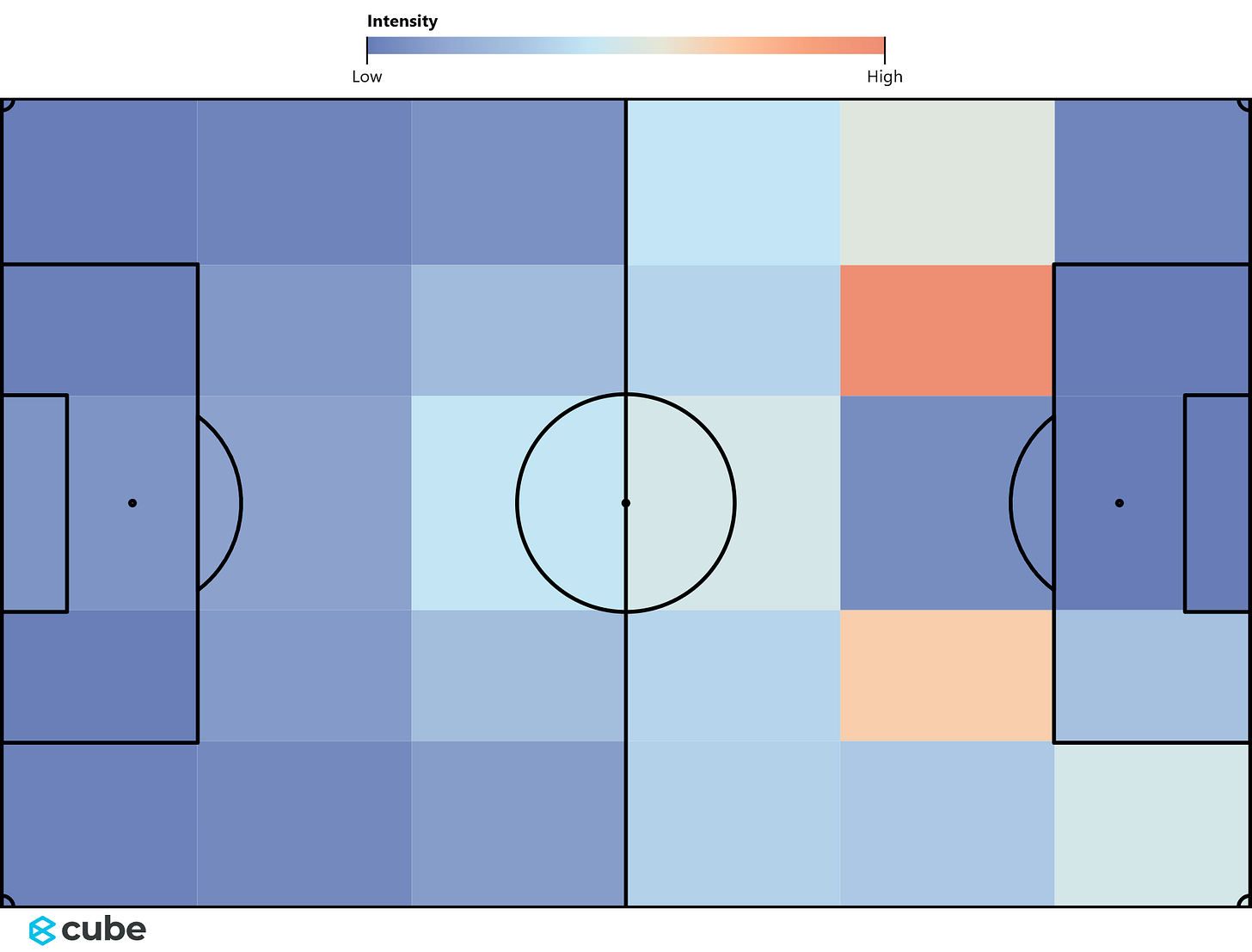 The Expected Threat (xT) zonemap shows clear issues. The left half-space offered some danger, largely through Mac Allister’s pass to Isak which led to a chance, but Zone 14 was barely touched. That’s the most dangerous area on the pitch, and Liverpool ignored it. The right wing was essentially non-existent, which is unforgivable when you have Mohamed Salah in the side.